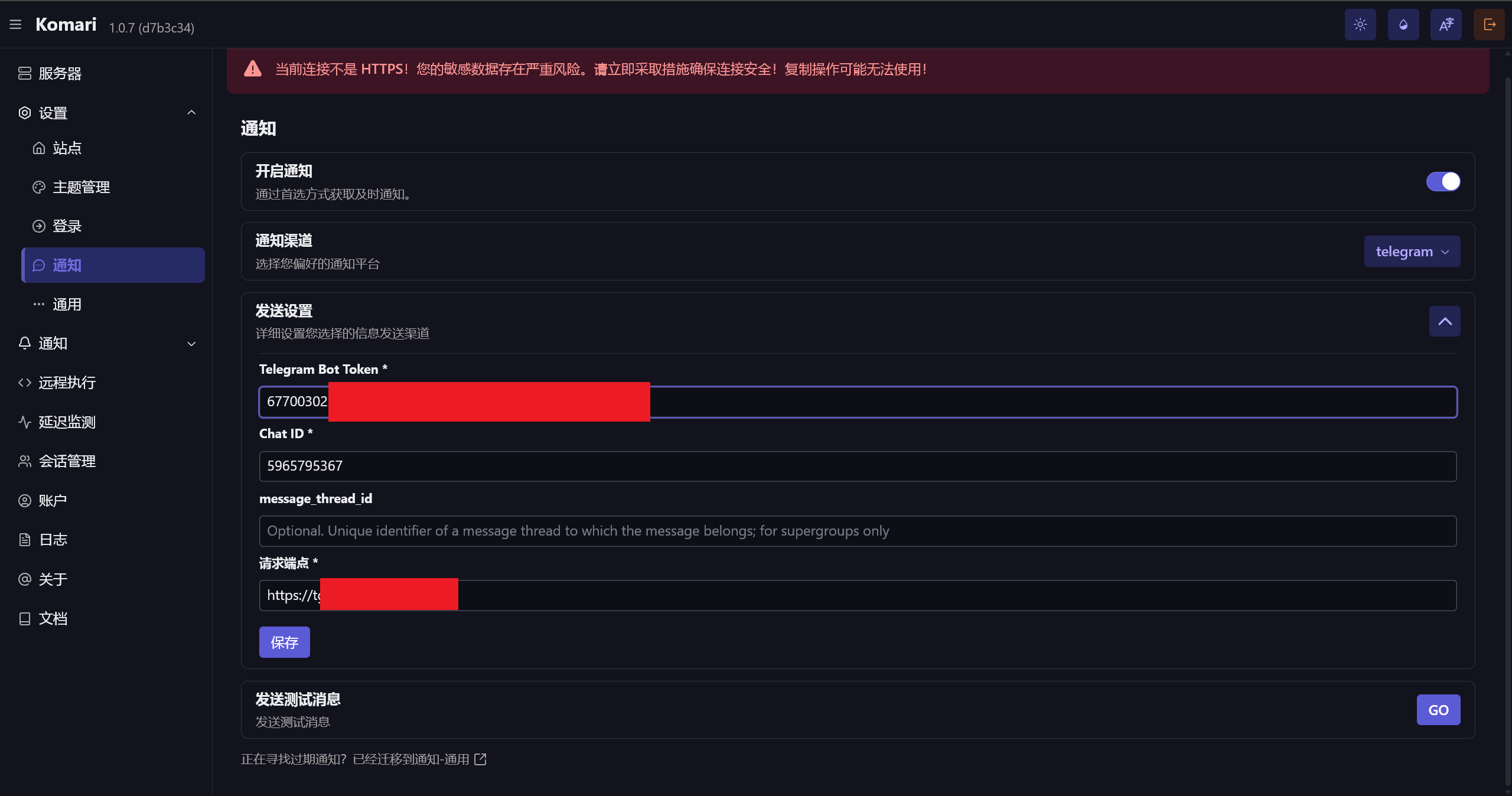 保存后,点击下方的 GO 测试发送,并检查是否收到信息即可